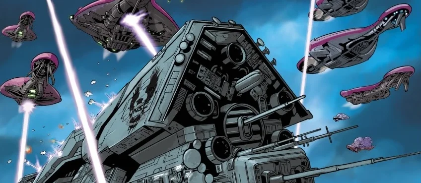 UNSC Infinity under attack from Covenant remnant forces during the Battle of Aktis IV, July, 2558.