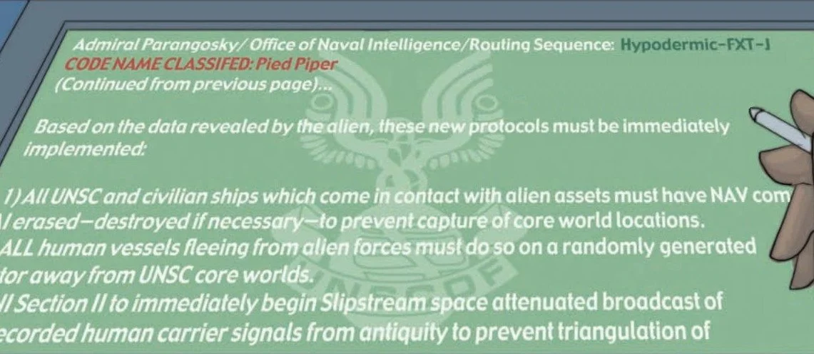In an effort to limit the ability for the Covenant to discover human colonies, including the inner colonies and Earth, the Cole Protocol was established to wipe all ship navigation data when the UNSC came into contact with any Covenant forces. The Cole Protocol also demanded that any human vessels retreating from battle perform slipspace jumps to a random location to ensure the Covenant couldn't follow any ships back to another colony. This protocol was first developed by Vice Admiral Preston Cole as Hypodermic-FXT-J following the Battle of the Great Bear in 2530, but did not become standing orders to all UNSC vessels until 2535.