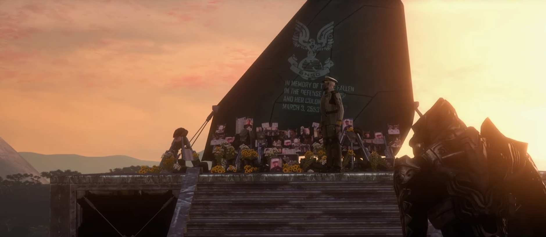 The Voi Memorial was erected in March 2553, marking the end of the Human-Covenant War and to remember all who were lost during the conflict. At the time, Master Chief Petty Officer John-117 was missing and presumed KIA during the Battle of Installation 00. Admiral Hood presided over the ceremony, which was attended, in much controversy, by Thel 'Vadam.